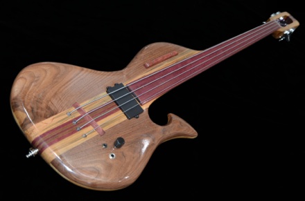 This is Mark’s Walnut Lobe. The body is black walnut with a maple core. This bass has a walnut and purpleheart neck and purpleheart board. This bass is here for a straight clean up and refin. We’ll be leveling and radiussing the board, re-shaping the neck and cleaning up the curves. An interesting feature of the bass is the rail/thumb rest.